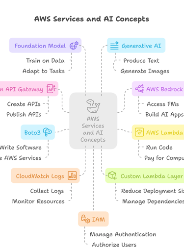 Error Handling: Good code includes try...except blocks to catch errors if something goes wrong, like if the AI model can't be called. Any print statements in the Lambda code will show up in CloudWatch logs, which is super helpful for seeing what happened.